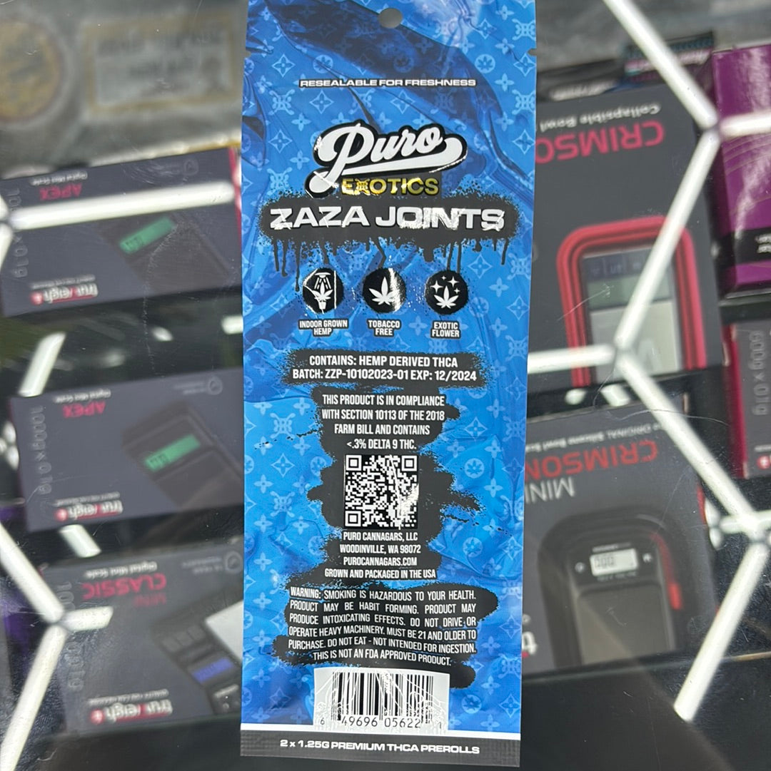 Puro exotics Zaza joints black ice 2.5G pre-rolls indica